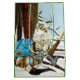 Gato da Floresta Norueguesa sentado ao lado de uma árvore com um dragão azul sentado num capacete de garrafa. Neve ao redor deles, espada e machado viking com eles.