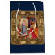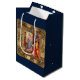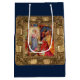 Saco brilhante de presente de marinho médio com uma imagem, na frente e atrás, de um trabalho de arte da Bíblia da Virgem Maria, José, e Jesus bebê e os três sábios que vieram visitar em um quadro de ouro ornamentado. Consulte cartão de saudação quadrado correspondente, cartão de saudação de 5" x 7", envelope, caixa de favoritos, etiqueta, adesivo quadrado e papel de embalagem. Veja toda a coleção Holiday Gift Bag nos TOUCHES ESPECIAIS | Seção Favoritos para festas.