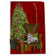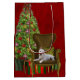 Bonito e branco Jack Russell Terrier senta-se numa cadeira guardando a árvore de Natal e os presentes de Natal amam o saco de presentes de Natal