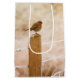 Design apresenta uma fotografia de um belo pássaro vermelho-assado-assado num poste de feno.