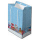 Nossa design da Wonderland de inverno Snowfall & Cabins Light Blue Gift Bag apresenta a ilustração aquosa das cabines da neve em tons de vermelho, azul, azul claro, branco e bronzeado cercados por pinheiros verdes, escamas de neve de confetti brancas que caem suavemente ao redor.