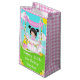 Essa bolsa de presente de aniversário fofa e caprichosa pode ser personalizada com um nome ou título como filha, neta, sobrinha, amiga etc. Ela apresenta uma cabeleira preta com pele clara em um assento de limonada rosa que é decorado com flores e bunting. Ao fundo está um céu azul, sol e borboletas. Isto é perfeito para uma festa de aniversário de verão. Gráficos de MUJKA