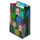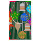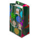 Esta bolsa de presentes tem um design que se parece com ornamentos em vermelho, verde, azul, rosa, ouro, prata e branco em uma árvore de Natal.