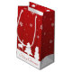Simples ilustração de Natal moderna e minimalista, com silhuetas brancas de renas, árvores, bonecos de neve e flocos de neve, com Feliz Natal a saudar de fundo vermelho.