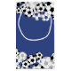 Bolas de futebol rodeiam esta bolsa de presente personalizada azul com texto editável. Múltiplas bolas de futebol, preto, branco e design de cinza para felicitar nosso convite de festas de Convite para Futebol.