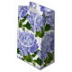 Este saco de presente é mostrado em uma cor branca em um acabamento brilhante com um adorável impressão de flor azul de hydrangea lavanda.