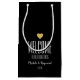 Pequenos sacos de presentes brilhantes para embalar as bolsas de boas-vindas dos seus convidados para a sua recepção de casamento ou janto de ensaio ou qualquer outro evento especial, basta mudar a redação. A cor da bolsa pode ser mudada para qualquer coisa, mostramos preto. Bag mede 5 pol de comprimento x 3 pol de largura x 8,5 pol de altura