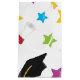 Aqui é mostrado um padrão de tema de formando completo com estrelas coloridas amarelas, azuis e verdes, bem como bonés de formatura e diplomas. Um saco de presente colorido, peça o seu hoje!