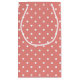 O design de saco de presente de Páscoa Whimsical apresenta um belo coelho feminino com vestido cor-de-rosa e coroa floral sobre fundo de bolinhas rosa coral. Texto personalizável do "Felz pascoa"