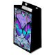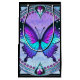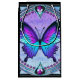 Uma borboleta vibrante com tons de azul e roxo é centrada dentro de um design circular ornamentado, cercada por intrincados padrões florais e joias decorativas. A composição total expele uma estética de vidro manchado com uma mistura harmoniosa de cores e simetria.