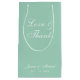 Um simples saco de favores. Tem apenas texto branco sobre fundo verde-menta. A mensagem "Amor e Obrigados" e os nomes da noiva e do noivo são escritos em caligrafia elegante.