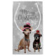 Tema do cão - Um par de chihuahuas em chapéus de inverno com pom pomson um fundo de cinza prateada neve com Feliz Natal em fontes prateadas