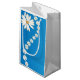Saco de presentes mostrado numa cor sólida de branco com um impressão de margarida azul giro. Personalize este item ou comprar como está.