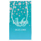 Um belo e glamouroso saco de presentes de 16 anos. Brilhante azul verde-lacrimejante cor verde-lacrimejante com borrifo de diamante sujo. Modelos para um nome, 16 anos e uma data. Data de nascimento ou data da festa/aniversário. Letras brancas e lacrimejadas. O nome é escrito com um script de estilo manuscrito.