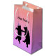 Esta bolsa de presente é triangular em bonito cores brilhantes de pêssego, rosa e roxo, com a silhueta negra de dois ursos dançarinos felizes vestindo chapéus festivos de partidos estriados. Personalize seu texto com o modelo.