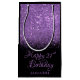 Saco de presente moderno com brilho roxo e texto de aniversário sobre preto. Este modelo atenderia a qualquer idade que for fácil de personalizar.