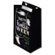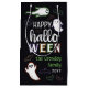 Saco de presente de Dia das Bruxas feliz e manchado personalizado com seu nome em uma fonte verde assustadora cercada por fantasmas e morcegos desenhados à mão.