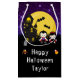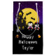 Essa bolsa de presente divertida e assustadora pode ser personalizada com um nome ou título, como filha, neta, sobrinha, amiga etc. Apresenta vampiros bonitos ao lado de uma casa assombrada. Ao fundo está uma lua de cheio com morcegos e um céu noturno roxo com estrelas. Isto é perfeito para o Halloween.