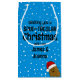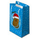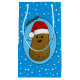 Adorável e engraçado batata marrom feliz vestindo um chapéu de Papai Noel vermelho e branco. A batata está em um estilo de arte cartoon e castanho colorido, tem braços e dedos colados e um sorriso grande e feliz com pontos para os olhos. O chapéu de Papai Noel em sua cabeça é vermelho, com um verme branco e uma pompom branca pendurados. Ele tem dentro a forma oval azul claro com uma estrutura azul escura e duas folhas ocas verdes com duas bagas vermelhas no topo do oval. A cor de fundo é um azul claro, com flocos de neve brancos flutuando prestes a dar uma sensação festiva a essas sacolas de presentes sazonais bonitinhas. Na parte de trás da bolsa estão modelos de texto para deixar como estão ou substituir o texto por sua própria mensagem E adicionar seus nomes.