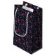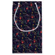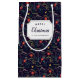 Saco de presente com padrão de Natal festivo apresenta um padrão botânico invernal de flores de poinsettia vermelha, compros de pínus verdes e peras de inverno em um rico fundo azul de meia-noite. Personalize com três linhas de texto personalizado; mostradas com "Feliz Natal" e seu nome.