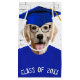 Óculos pretos em um cão recuperador de ouros em uma camiseta azul e boné de formatura sobre fundo de tijolos para formando. O texto é editável.