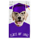 Óculos pretos em um cão que recupera o ouro vestindo uma t-shirt roxa e um boné de formatura sobre fundo de tijolos para formando. O texto na t-shirt é editável.