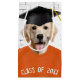 Cachorro do recuperador de ouros vestindo uma t-shirt laranja e um boné de formatura preto no fundo da parede de tijolos para formando. O texto na t-shirt é editável.
