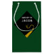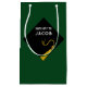 Saco de presente de graduação com design preto e boné de ouro criativo em fundo verde. Editar texto para adicionar o nome do formando da classe de mais velho.