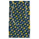 Esta bolsa de presente tem um médio de ovais moderno século design em marinho com semicírculos em tons de amarelo e sombras de cinza em um campo de preto.