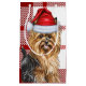 Amantes de cães adorarão receber ou dar este saco de presente de feriado bonito e engraçado com um adorável cão Biewer Terrier em um chapéu de Papai Noel em um fundo de padrão de xadrez sazonal vermelha.