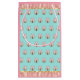 Apresenta uma joia decorada floral em rosa e creme com um arco azul no pescoço. Ela é colocada sobre um fundo azul que é aparado com fita rosa e dourada. Pronto para personalizar.