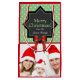 Sacos de presente de Natal personalizados. Padrão de bolinhas verde festivo com arcos vermelhos e feixes de estrelas negras e saudações de "Feliz Natal". O saco de presentes tem uma cor vermelha de fundo que você pode mudar. Personalize com sua própria fotografia e texto.