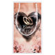 Bolsas de presente de casamento elegantes e bonitas que você pode personalizar. Esta bolsa de presente tem uma imagem impressa de uma pintura acrílica de dois anéis de casamento prateados dentro de um coração de cristal. Há também duas lindas rosas brancas no design. Ótima bolsa de presente de casamento para colocar seu presente de casamento dentro para os noivos.