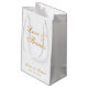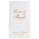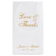Um simples saco de favores. Tem apenas ouro texto sobre fundo branco. A mensagem "Amor e Obrigados" e os nomes da noiva e do noivo são escritos em caligrafia elegante.