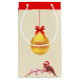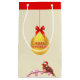 Bonita bolsa de presente com uma grande bola de Natal de ouro e um passarinho de Natal em fundo bege claro.