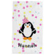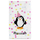 Personalize este pinguim de desenho animado vestindo um chapéu colorido com um padrão de confete em círculo no saco de presentes de fundo com um nome ou texto escolhido.