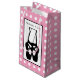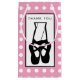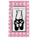 Obrigado, saco de presentes com uma ilustração negra de um sapatilhão de dançarinas balés e suas pernas inferiores que são transparentes, permitindo que a cor do fundo apareça. Ballerina está de pé nos dedos dos pés, em ponto. Fundo é um padrão feito de bolinhas brancas em rosa.