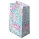 Um Pequeno Saco Presente, bonito e feminino, com um padrão de rosas cor-de-rosa sobre fundo azul-céu, pontilhado com borboletas brancas. Parte da coleção Posh & Painterly 'Summer Days', este padrão pode ser facilmente ajustado a ajustado de qualquer Saco de Presente.