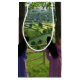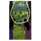 Duas jovens senhoras gêmeas olham de trás de duas árvores para um verdejante vale entre colinas rochosas, cheio de pequenas fazendas, sebes e muros de pedra e irrigado por um riacho cintilante que desce as colinas.