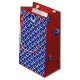 O saco azul requintado do presente do redemoinho envolve rapidamente seu presente no estilo. Maneira perfeita de apresentar presentes em uma celebração incorporada. Os painéis dianteiros e traseiros têm por todo o lado nos padrões complementares que caracterizam redemoinhos azuis brilhantes. Os painéis laterais são vermelho brilhante com um redemoinho azul pequeno ocasional. Design original por Anne Bell.