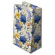 Este pequeno saco de presentes de papel é mostrado em um adorável impressão floral azul multicolorido. Personalize este saco-presente ou comprar como está. Impressão licenciado