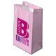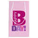 Uma bolsa de presente de aniversário feliz, rosada, com as palavras "Parabéns!" em vários tons de rosa e roxo.