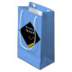 Saco de presente de graduação com design de boné preto e ouro sobre fundo azul claro. Editar texto para adicionar o nome do formando.