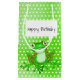 Sapo verde giro sobre fundo de bolinhas verde-neon e branco com bolha de fala para qualquer aniversário etário. O texto pode ser editado.