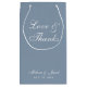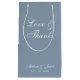 Uma simples bolsa de lembrança de casamento com uma cor muito moderna: azul poeira. Tem apenas texto branco em fundo azul poeira. A mensagem "Amor & Agradecimento" e os nomes da noiva e do noivo são escritos em caligrafia elegante.