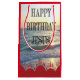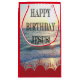 Uma canvas pintada com o soreno pôr do sol sobre o oceano, adornada com a saudação corajosa de "Feliz Aniversário Jesus" e embelezada com árvores de Natal que descansam sobre uma série de colinas vermelhas na base design.