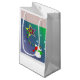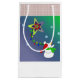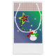 Um design divertido com um boneco de neve balbucioso pendurado numa estrela de férias, uma xadrez ao longo do topo.