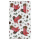 Este saco de presente de Natal festivo da vaqueira ocidental apresenta um padrão desenhado à mão de ilustrações ocidentais de botas de vaqueira, pinecones, pinus e groselhas, tudo contra um fundo branco elegante.