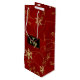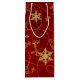 Saco de presente de vinho festivo, feito em vermelho rico, com espirais de ouro, sagrado e flocos de neve. A frente do saco de vinho tem uma área de texto retangular preta, com texto gráfico dourado a ler JOY.