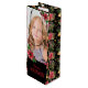 Saco de vinho de presente de Natal elegante para personalizar com sua foto favorita da família. Tem belas poinsetos de aquarelas pintadas manualmente com ramificações de pínus, cones de pínus e pererecas de bagas. Diz "Feriados Mais Felizes". O reverso e os lados têm um padrão de poinsettias, pássaros, sinos de latão, fatias de laranja, canas doces e bastões de canela. | bolsas de vinhos de férias de Natal | Correspondência entre cartões de Natal, autocolantes e outros produtos, bem como mais designs disponíveis no meu compro, em www.zazzle.com/digiscrapthat